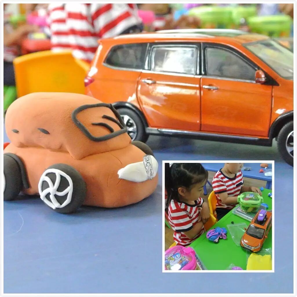 6月1日沈阳,福田乘用车向苏家屯区新兴屯村宝宝幼儿园提供书包、橡皮泥、水彩笔等文具由老师带领宝宝用橡皮泥捏造伽途汽车。